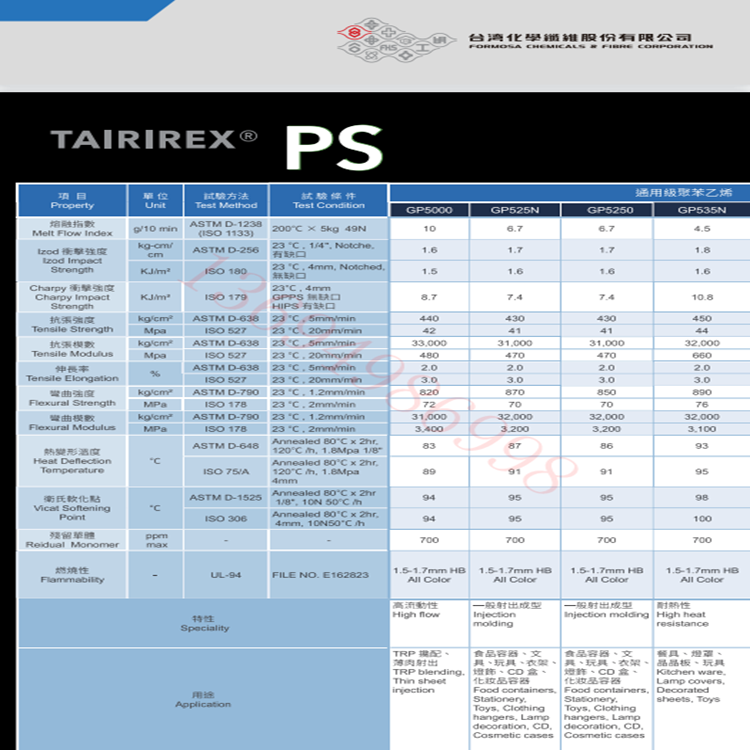 台化GPPS树脂聚苯乙烯牌号用途介绍